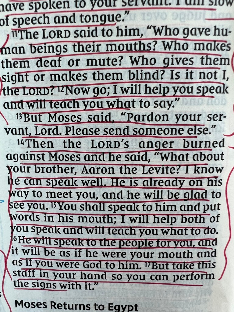 Exodus 4: The Lord appears to Moses and informs him that he is going to use him to free the Israelites. After the initial shock of the burning bush to {really} get Moses’s attention…